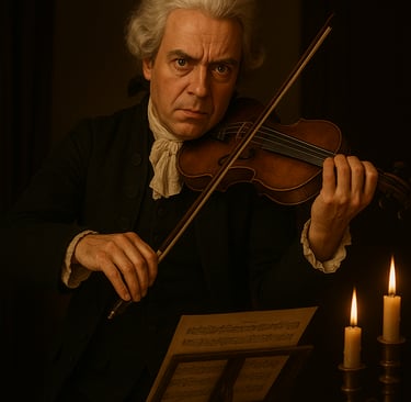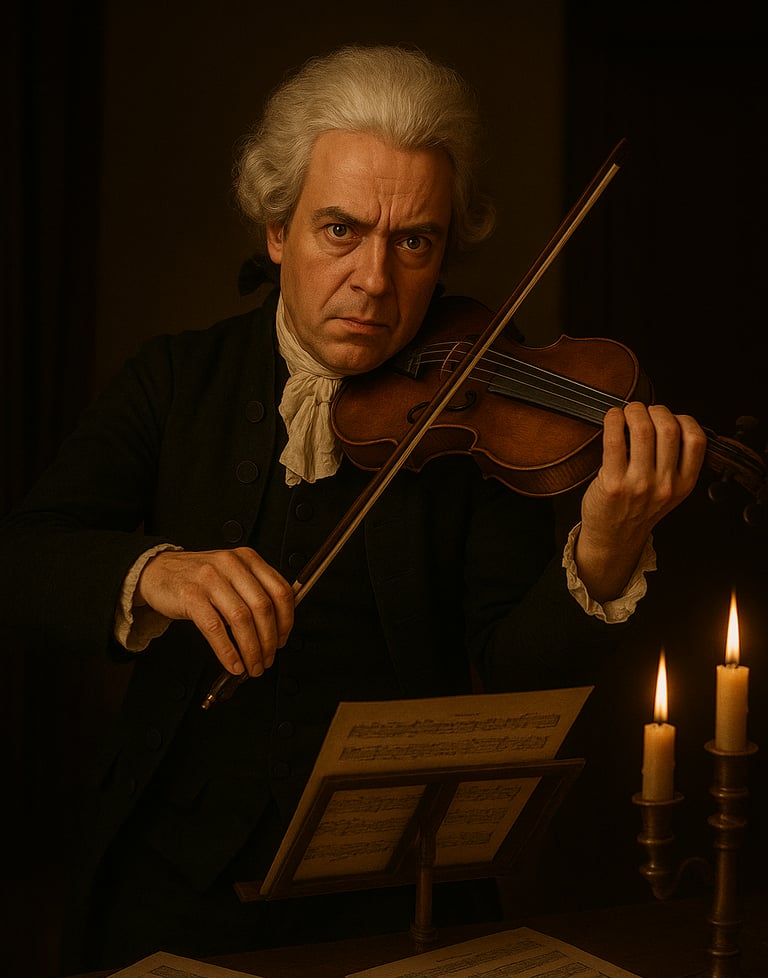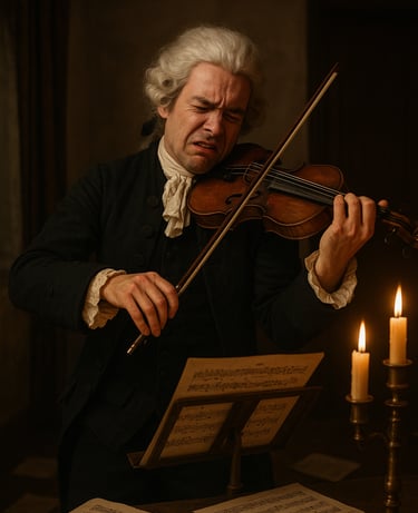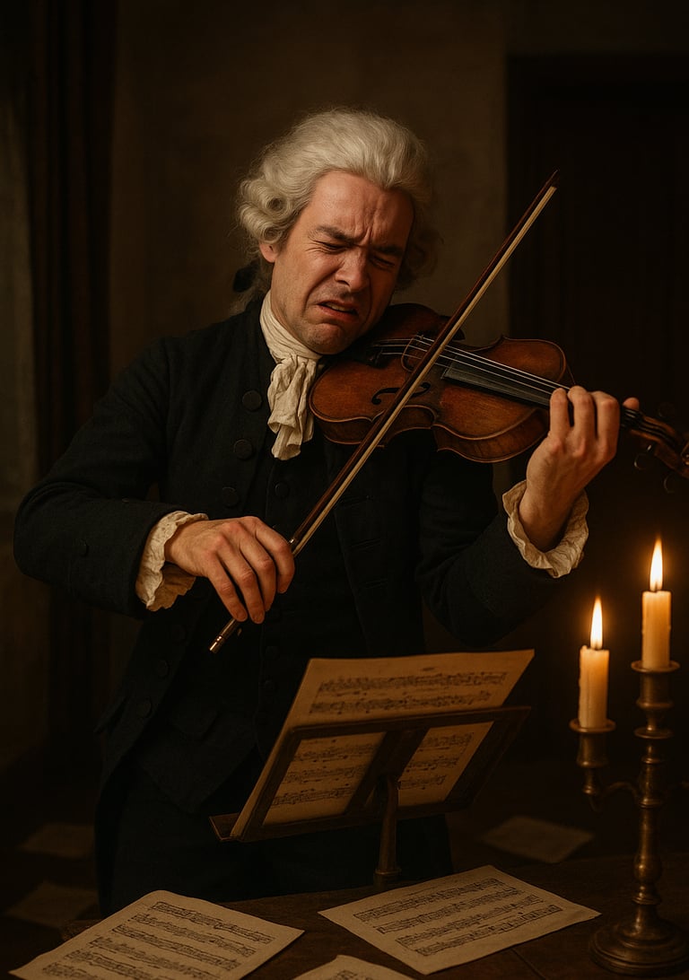 עד כדי כך שהוא מביע על פניו תיסכול ושאת נפש מהצליל שלו. באמת חבל עליו. גם ככה זה לא פשוט לחיות למישהו במעמד לא גבוה בסוף המאה ה-18.